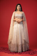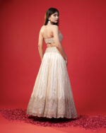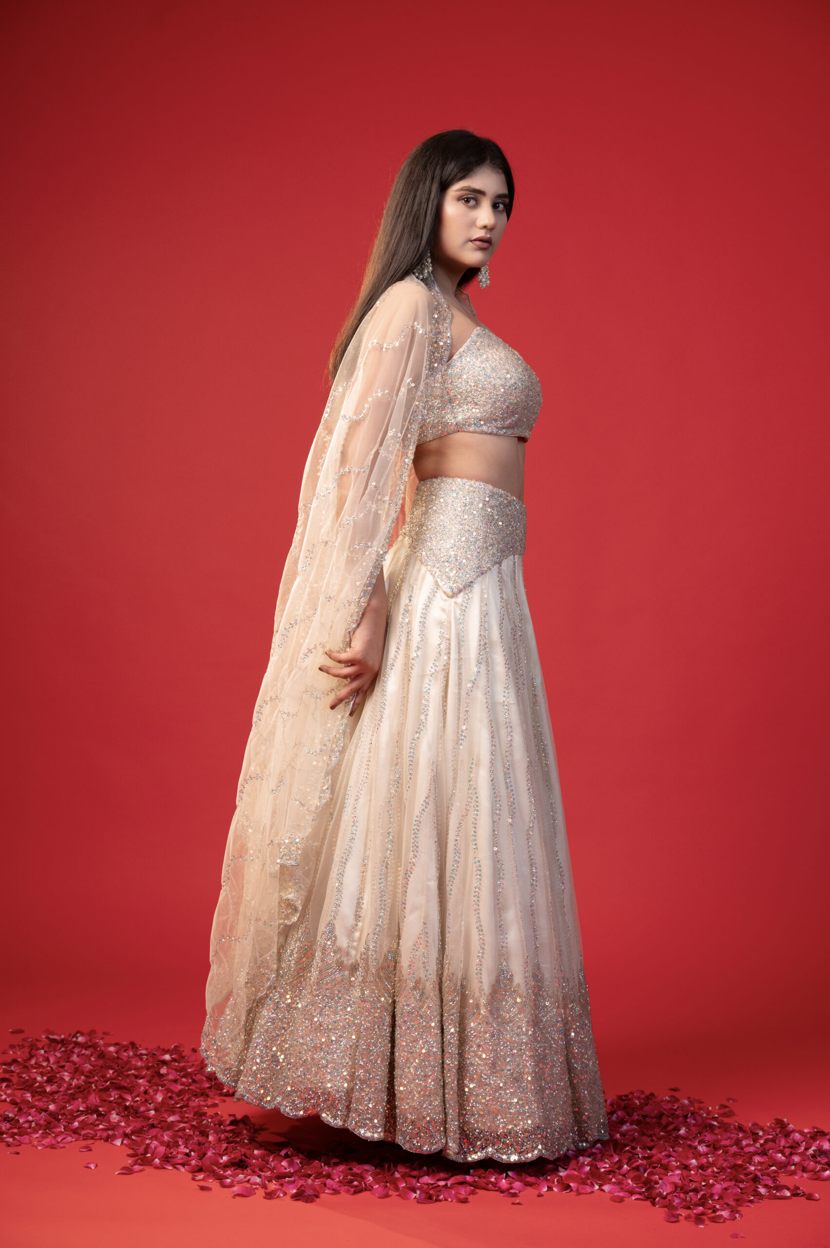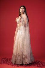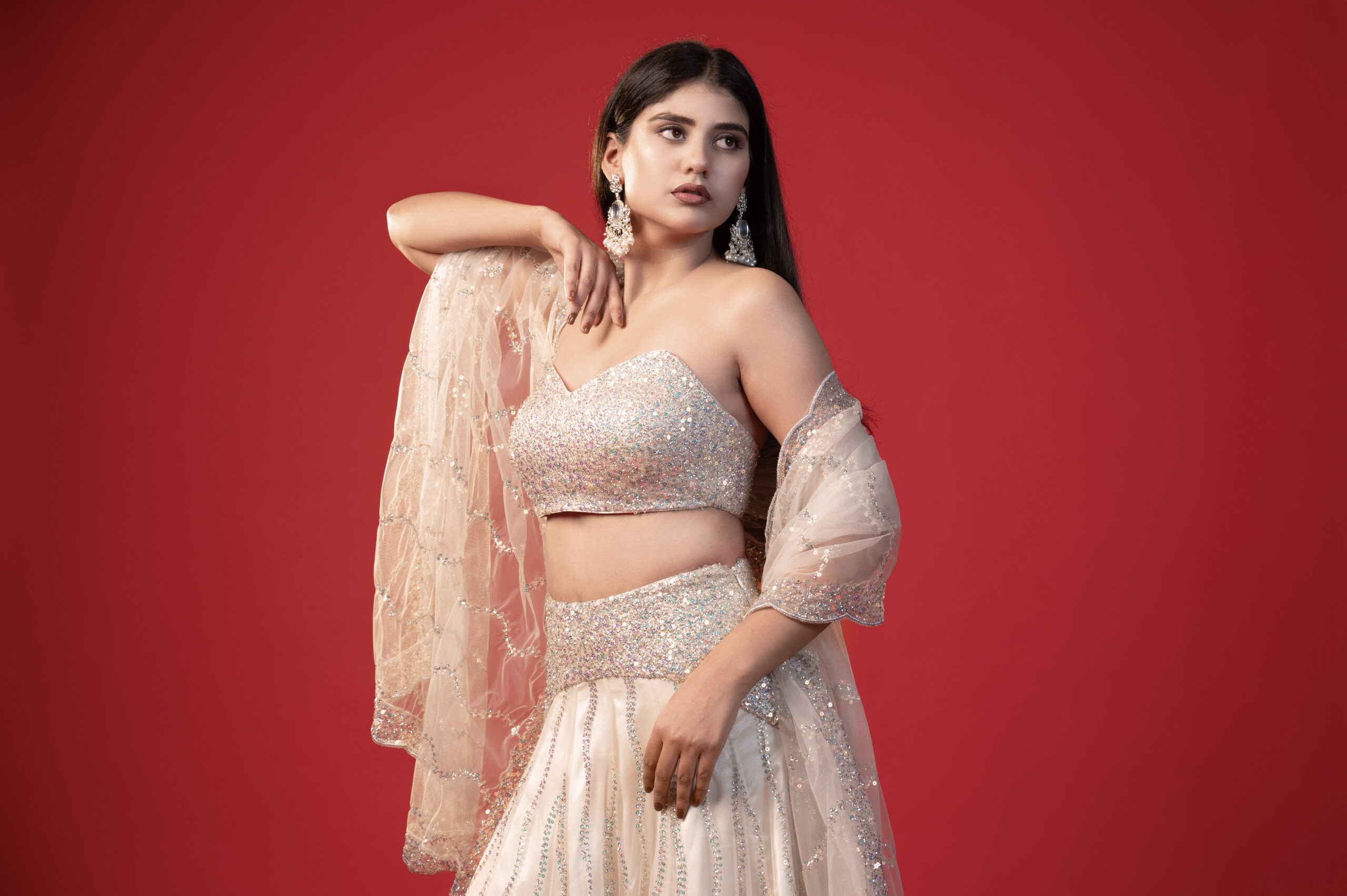 The strapless sweetheart blouse adds a touch of modern glamour, while the flowing dupatta