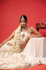 With a grand 20-kali flare, the lehenga moves like a warm breeze, while the square-neck blouse